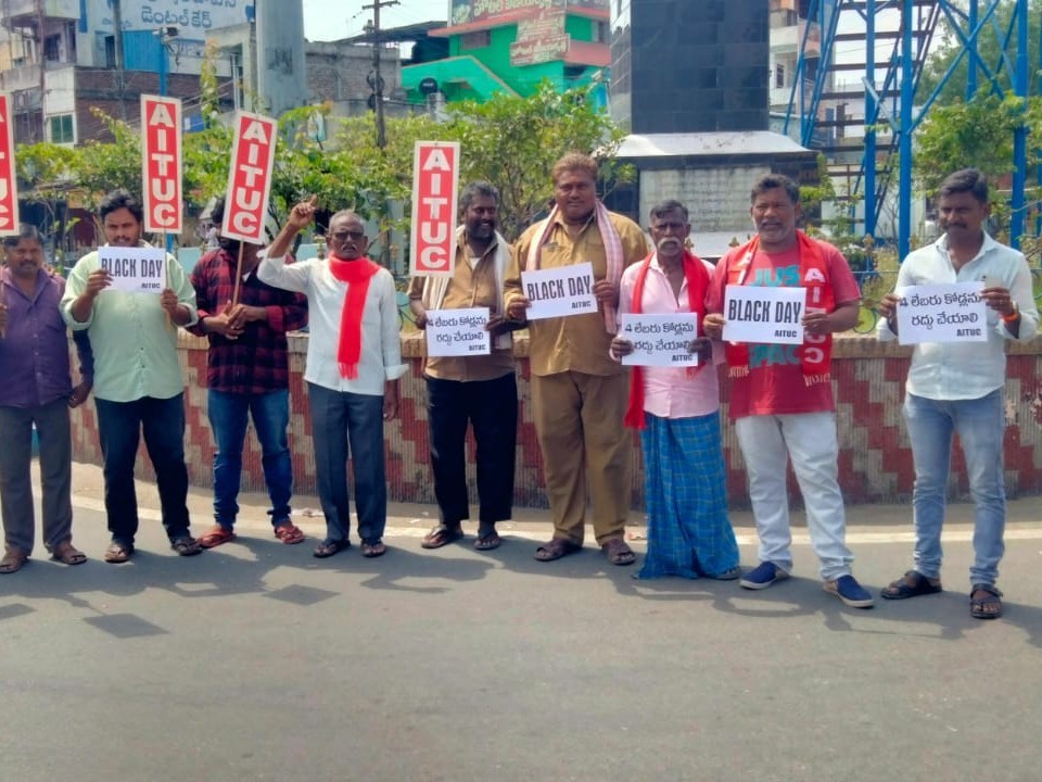 గుంటూరు: కేంద్రంలో నరేంద్ర మోదీ ప్రభుత్వం తీసుకువచ్చిన నాలుగు లేబర్ కోడ్లను రద్దు చేయాలని ఏఐటీయూసీ పిలుపు మేరకు పొన్నూరులో అంబేద్కర్ సెంటర్లో ఇవాళ ధర్నా నిర్వహించారు. నియోజకవర్గ కార్యదర్శి ఆరేటి రామారావు మాట్లాడుతూ.. కార్మిక వ్యతిరేక విధానాలకు నిరసనగా దేశవ్యాప్తంగా బ్లాక్ డే నిర్వహిస్తున్నట్లు తెలిపారు.