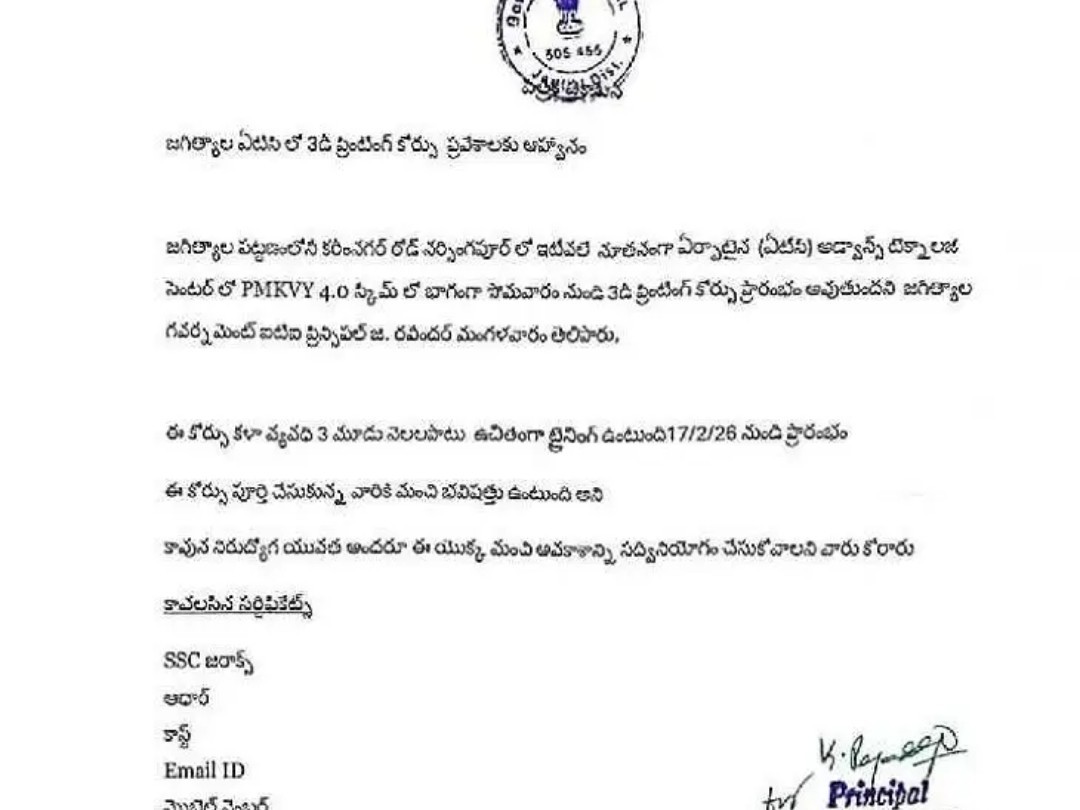 JGL: జగిత్యాల-కరీంనగర్ రోడ్డులోని నర్సింగాపూర్లో నూతనంగా నిర్మించిన అడ్వాన్స్ టెక్నాలజీ సెంటర్లో 3D ప్రింటింగ్ కోర్సులో ప్రవేశాలకు దరఖాస్తులను ఆహ్వానిస్తున్నట్లు కళాశాల ప్రిన్సిపాల్ రవీందర్ తెలిపారు. PMKVY 4.0 స్కీమ్లో భాగంగా సోమవారం నుంచి కోర్సు ప్రారంభమవుతుందని, ఈ కోర్సు 3 నెలలపాటు ఉంటుందన్నారు. నిరుద్యోగ యువత ఈ అవకాశాన్ని సద్వినియోగం చేసుకోవాలన్నారు.