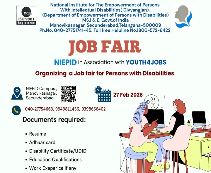 HYD: నేషనల్ ఇన్స్టిట్యూట్ ఫర్ విత్ ఇంటెలెక్చువల్ డిసెబిలిటీస్ ఆధ్వర్యంలో యూత్ 4 జాబ్స్ సహకారంతో దివ్యాంగుల కోసం ప్రత్యేక జాబ్ మేళా ఈనెల 27న సికింద్రాబాద్లోని NIEPID క్యాంపస్లో జరగనుంది. అర్హులైన అభ్యర్థులు తమ బయోడేటా, ఆధార్ కార్డు, దివ్యాంగ ధృవీకరణ పత్రం లేదా UDID కార్డు, విద్యార్హత సర్టిఫికేట్లు, పాస్పోర్ట్ సైజు ఫోటోలు తీసుకురావాలన్నారు.