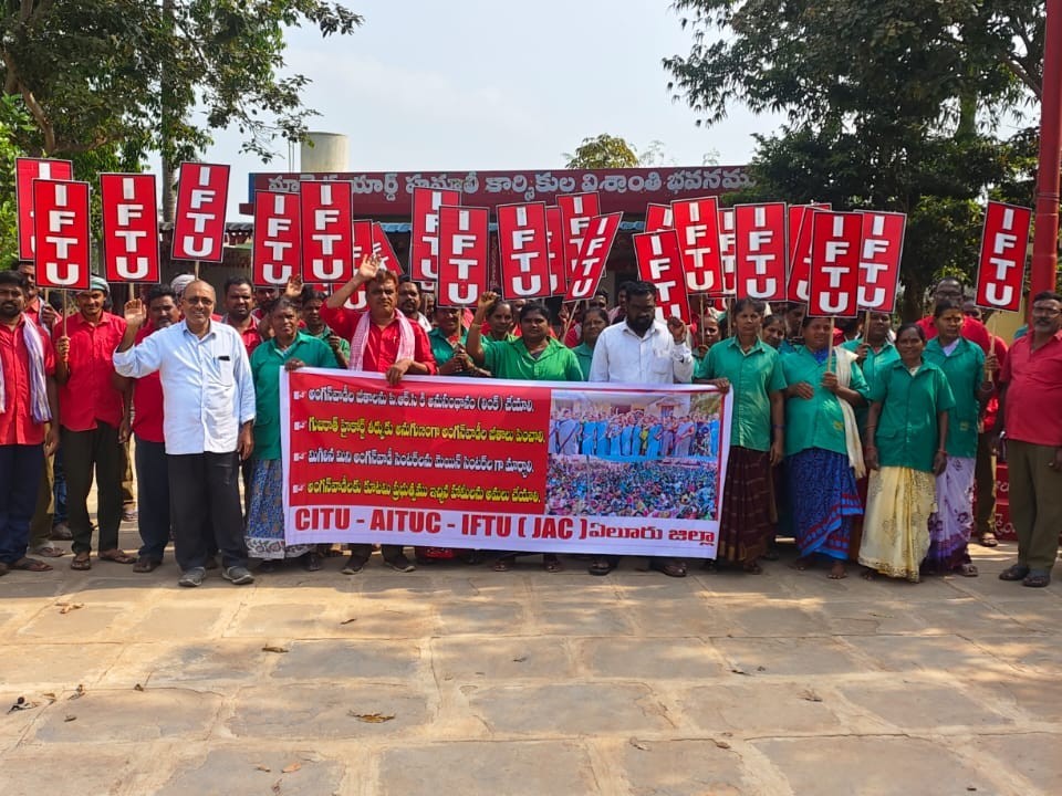 ఏలూరు వి.వి.నగర్ వద్ద మార్కెట్ యార్డు హమాలీ వర్కర్స్ యూనియన్ ఆధ్వర్యంలో అంగన్వాడీల ఆందోళనకు మద్దతుగా ప్రదర్శన జరిపారు. అంగన్వాడీల సమస్యలను వెంటనే పరిష్కరించాలని వారు డిమాండ్ చేశారు. కూటమి ప్రభుత్వం అధికారంలోకి వచ్చి రెండు సంవత్సరాలైనా అంగన్వాడీల సమస్యలను పరిష్కరించలేదని వారు విమర్శించారు. జీతాలు పెంచి ఉద్యోగ భద్రత కల్పించాలన్నారు.