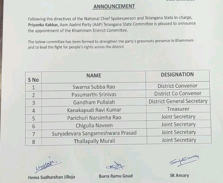 KMM: అట్టడుగు స్థాయి ఉనికిని బలోపేతం చేయడానికి ఖమ్మం జిల్లా కమిటీని నియమిస్తున్నట్లు ఆమ్ ఆద్మీ పార్టీ తెలంగాణ రాష్ట్ర కార్యవర్గం ప్రకటించింది. జిల్లా కన్వీనర్గా స్వర్ణ సుబ్బారావు, కో కన్వీనర్గా పసుమర్తి శ్రీనివాస్, ప్రధాన కార్యదర్శిగా గంధం పుల్లయ్య, సభ్యులుగా రవి కుమార్, నరసింహారావు, నవీన్, సూర్యదేవర సంగమేశ్వర ప్రసాద్, మురళిలను నియమించారు.
