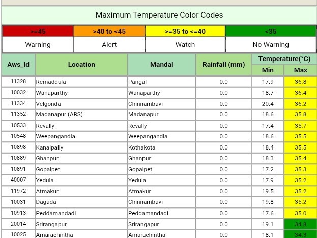 వనపర్తి జిల్లాలో ఎండల తీవ్రతలు విపరీతంగా పెరుగుతున్నాయి. గడచిన 24 గంటలో నమోదైన ఉష్ణోగ్రతలను అధికారులు ప్రకటించారు. అత్యధికంగా పానగల్ మండలం రేమద్దులలో 36.8 డిగ్రీల గరిష్ట ఉష్ణోగ్రత నమోదయింది. వనపర్తి 36.4, వెలుగొండ 36.2, మదనపూర్ 35.8, రేవల్లి 35.7, వీపనగండ్ల, కన్నాయిపల్లి 35.5, గణపూర్ 35.4, గోపాల్ పేట 35.3 డిగ్రీల ఉష్ణోగ్రతలు నమోదయ్యాయి.