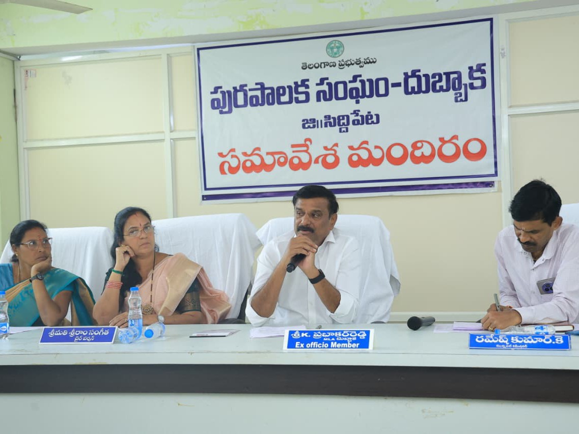 SDPT: దుబ్బాక పట్టణ కేంద్రంలోని మున్సిపల్ కార్యాలయంలో నూతన పాలకవర్గం తొలి సర్వసభ్య సమావేశం నిర్వహించబడింది. ఈ సందర్భంగా సమావేశంలో మున్సిపల్ పరిధిలోని పలు కీలక అంశాలపై సమగ్రంగా చర్చించారు. పట్టణంలో పారిశుధ్య నిర్వహణ, ప్లాస్టిక్ నిషేధం, నీటి సమస్యపై చర్చించారు. ఈ కార్యక్రమంలో MLA కొత్త ప్రభాకర్ రెడ్డి, సభ్యులు ఫాల్గొన్నారు.