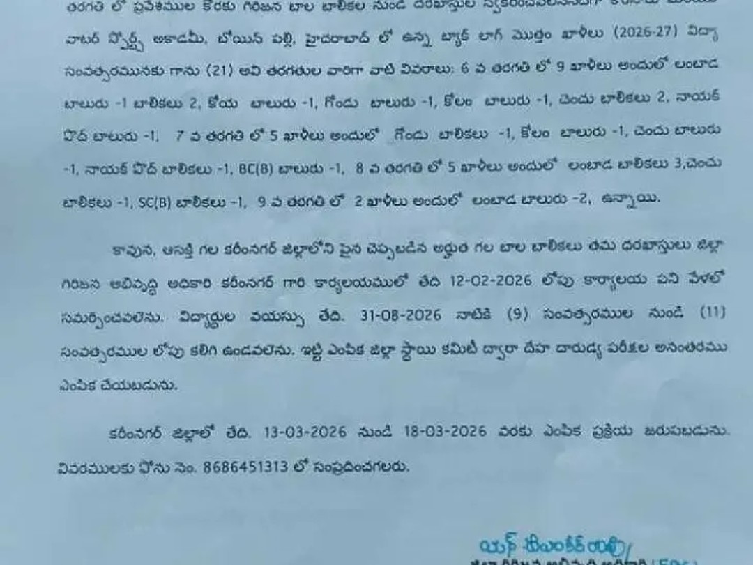 కరీంనగర్: హైదరాబాద్ బోయినపల్లిలోని వాటర్ స్పోర్ట్స్ అకాడమీలో 2026-27 విద్యా సంవత్సరానికి 5 తరగతిలో ప్రవేశాలకు గిరిజన బాలబాలికల నుంచి దరఖాస్తులు కోరుతున్నట్లు జిల్లా గిరిజన అభివృద్ధి అధికారి దివాకర్ రావు తెలిపారు. దీంతో పాటు పలు తరగతులలో ఖాళీగా ఉన్న 21 సీట్లను సైతం భర్తీ చేస్తామన్నారు. ఆసక్తి గలవారు ఈ నెల 12లోగా దరఖాస్తు చేసుకోవాలన్నారు.