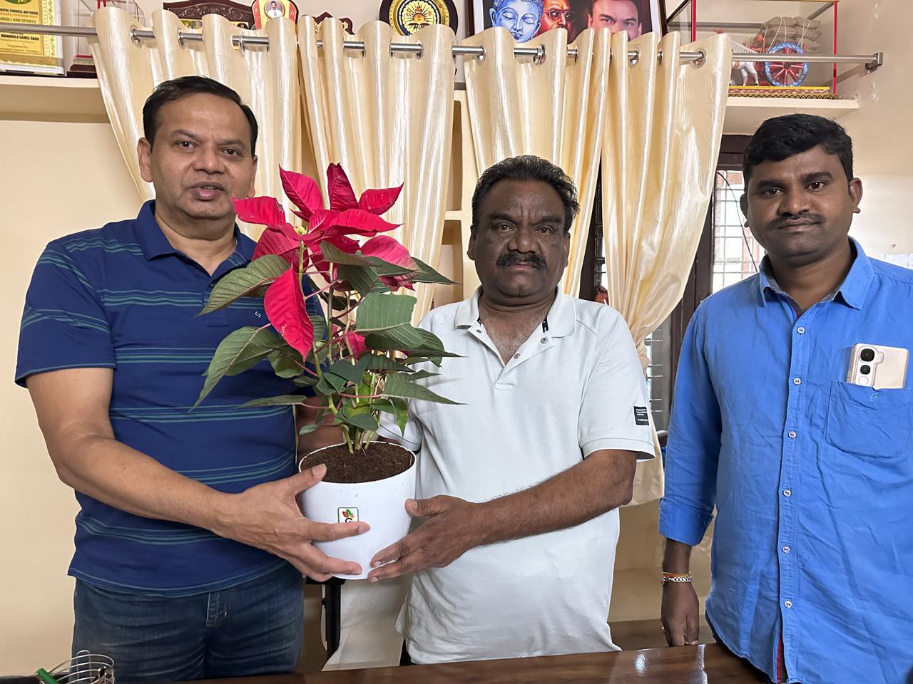 SRPT: తుంగతుర్తి శాసనసభ్యులు మందుల సామెల్ను శనివారం హైదరాబాద్లోని వారి నివాసంలో మండల పరిధిలోని మిర్యాల గ్రామానికి చెందిన NRI కాస రాకేష్ యాదవ్, కొమ్ము నగేష్లు మర్యాద పూర్వకంగా కలిశారు. ఈ సందర్భంగా ఎమ్మెల్యేకు వారు పుష్పగుచ్ఛం అందించి శుభాకాంక్షలు తెలిపారు. అనంతరం పర్యావరణ పరిరక్షణలో భాగంగా ఒక మొక్కను బహుకరించి, నియోజకవర్గ సమస్యలు, అభివృద్ధిపై చర్చించారు.