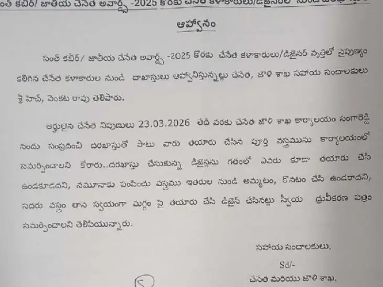 SRD: జిల్లాలో జాతీయ చేనేత అవార్డులకు అర్హులైన వారు మార్చి 23వ తేదీలోగా దరఖాస్తు చేసుకోవాలని చేనేత శాఖ సహాయ సంచాలకులు వెంకటరావు తెలిపారు. దరఖాస్తుదారులు తాము స్వయంగా మగ్గంపై రూపొందించిన కొత్త డిజైన్లను సమర్పించాల్సి ఉంటుందని పేర్కొన్నారు. గతంలో ఎక్కడా లేని వినూత్న డిజైన్లకు ప్రాధాన్యత ఉంటుందని, వివరాలకు స్థానిక చేనేత కార్యాలయంలో సంప్రదించాలన్నరు.