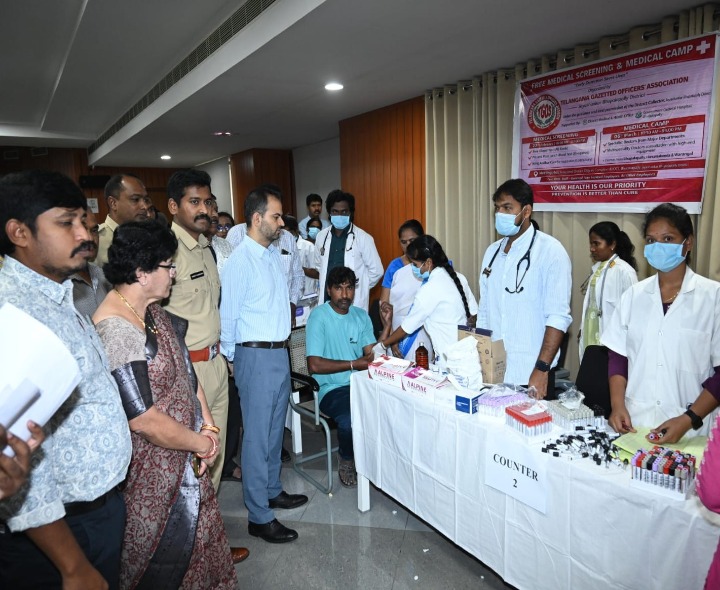 BHPL: జిల్లా ఐడీఓసీ కార్యాలయంలో తెలంగాణ గెజిటెడ్ ఉద్యోగుల సంగం ఆధ్వర్యంలో ఉచిత వైద్య శిబిరం నిర్వహించారు. ముఖ్య అతిథిగా కలెక్టర్ రాహుల్ శర్మ హాజరయ్యారు. ఆయన మాట్లాడుతూ.. ఉద్యోగులు ఆరోగ్యంగా ఉంటేనే ప్రజలకు మెరుగైన సేవలు అందించగలరని పేర్కొన్నారు. ప్రభుత్వ సిబ్బంది నిరంతరం ప్రజలతో మమేకమై విధులు నిర్వహిస్తారని, వారి ఆరోగ్యంపై ప్రత్యేక శ్రద్ధ చూపాలని అన్నారు.