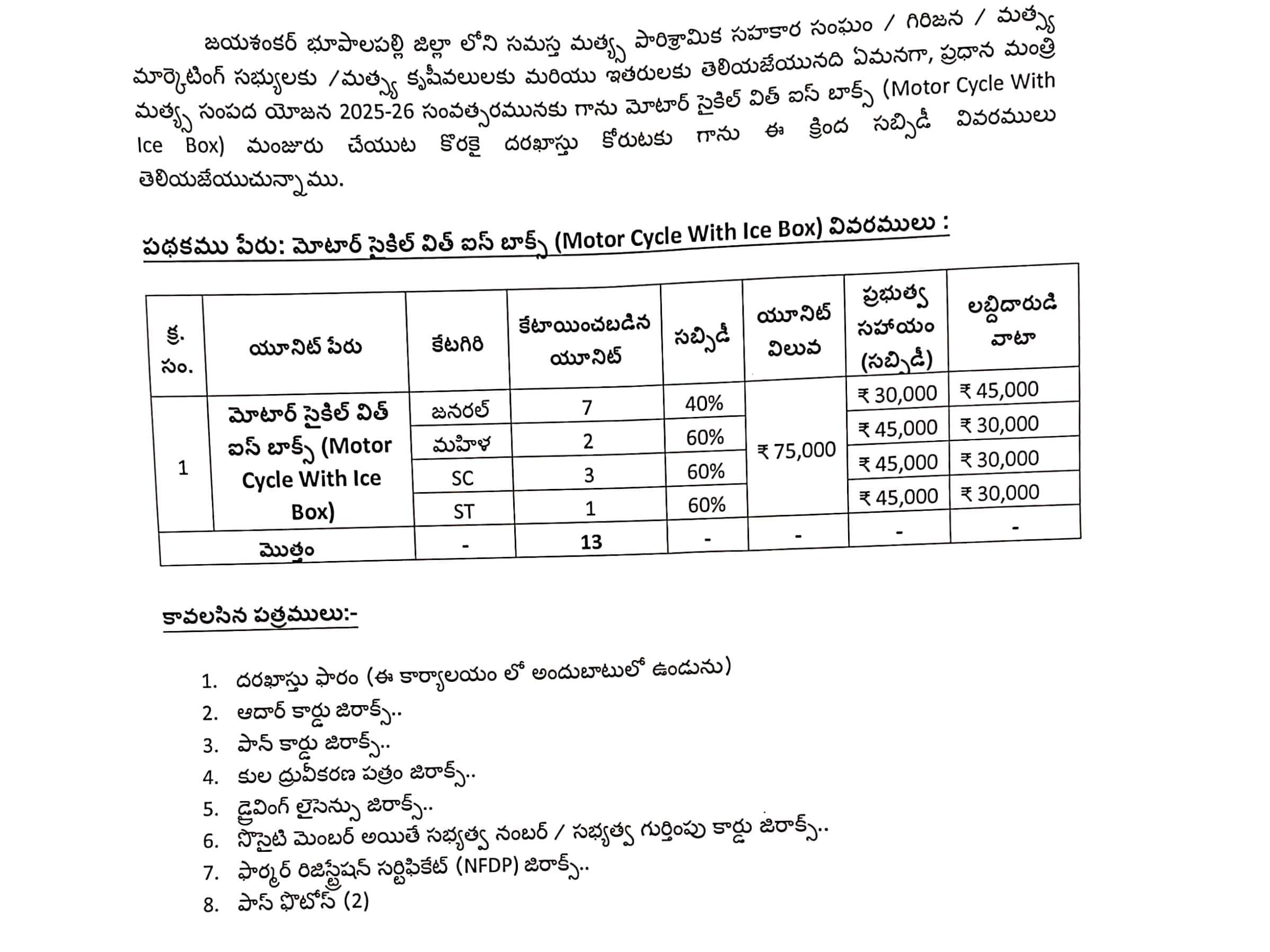 BHPL: భూపాలపల్లి జిల్లాలోని మత్స్యకారులు, మత్స్య కృషీవలులకు ప్రధాన మంత్రి మత్స్య సంపద యోజన 2025-26 కింద మోటార్ సైకిల్ విత్ ఐస్ బాక్స్ మంజూరు చేయడానికి దరఖాస్తులు ఆహ్వానిస్తున్నట్లు జిల్లా మత్స్య శాఖ అధికారి వై. విజయ్ కుమార్ తెలిపారు. ఆసక్తి గల అర్హులైన మత్స్యకారులు జిల్లా మత్స్య శాఖ కార్యాలయంలో మార్చి 5వ తేదీలోపు దరఖాస్తులు సమర్పించాలని కోరారు.