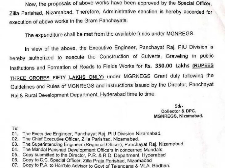 NZB: మహాత్మా గాంధీ జాతీయ ఉపాధి హామీ పథకం కింద బోధన్ నియోజకవర్గానికి రూ.3.5 కోట్లు మంజూరయ్యాయి. ఎమ్మెల్యే చొరవతో బోధన్, ఎడపల్లి, రెంజల్, నవీపేట్, సాలూర మండలాల్లో రోడ్లు, డ్రైనేజీలు, కల్వర్టుల నిర్మాణానికి ఈ నిధులు కేటాయించారు. పనులను తక్షణమే ప్రారంభించాలని కలెక్టర్ ఇలా త్రిపాఠి అధికారులను ఆదేశిస్తూ ఉత్తర్వులు జారీ చేశారు.