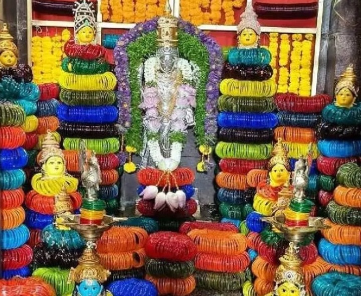 VKB: తాండూర్ మున్సిపల్ పరిధిలోని శ్రీనగరేశ్వర దేవాలయంలో అమ్మవారికి లక్ష గాజులతో అర్చన నిర్వహించారు. అమ్మవారి జయంతిని పురస్కరించుకుని లక్ష గాజులతో అలంకరించారు. ఈ సందర్భంగా పలువురు మాట్లాడుతూ.. అమ్మవారి దీవెనలతో ప్రతి ఒక్కరు ఆయురారోగ్యాలతో, సుఖసంతోషాలతో అష్టైశ్వర్యాలతో ఉండాలని ఆకాంక్షించారు.