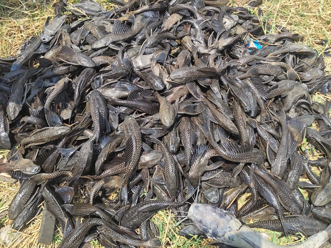 NLG: చిట్యాల మండలం పెద్దకాపర్తి చెరువులో మత్స్యకారులు చేపల వేట కొనసాగించి సుమారు 5 టన్నుల డెవిల్ ఫిష్లను పట్టుకున్నారు. కాల్వల ద్వారా చేరిన ఈ విదేశీ చేపలు చెరువులోని ఇతర చేపలను తినేస్తుండటంతో, తమ జీవనోపాధి దెబ్బతింటోందని గ్రామంలోని మత్స్యకార కుటుంబాలు ఆవేదన వ్యక్తం చేస్తున్నాయి. అధికారులు వెంటనే స్పందించి వీటిని తొలగించి తమను ఆదుకోవాలని కోరారు.