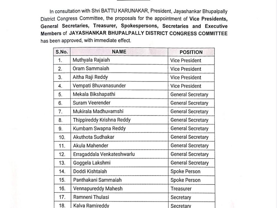 BHPL: జిల్లా కాంగ్రెస్ వైస్ ప్రెసిడెంట్, జనరల్ సెక్రెటరీలను TPCC నియమించింది. వైస్ ప్రెసిడెంట్లుగా రాజయ్య, సమ్మయ్య, రాజిరెడ్డి, భువనసుందర్, జనరల్ సెక్రెటరీలుగా బిక్షపతి, సురేందర్, మధువంశి, కృష్ణారెడ్డి, స్వప్నారెడ్డి, సుధాకర్, పూర్తి కమిటీని నియమించారు. జిల్లాలో పార్టీ బలోపేతమే ప్రధాన లక్ష్యంగా ప్రతీ ఒక్కరూ పని చేయాలని TPCC చీఫ్ సూచించారు