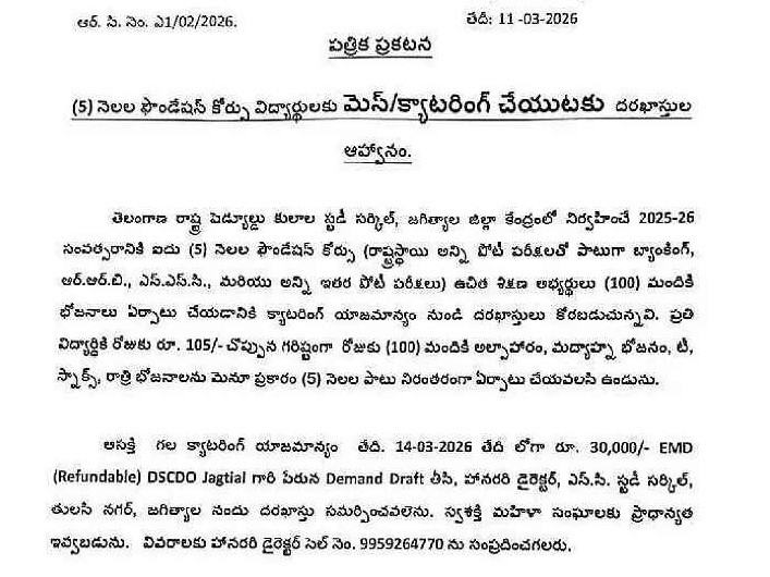 JGL: పట్టణంలో నిర్వహించే ఐదు నెలల ఫౌండేషన్ కోర్సుకు శిక్షణ పొందుతున్న 100 మందికి భోజనాల కోసం మెస్/క్యాటరింగ్ నిర్వహించేందుకు దరఖాస్తులను ఆహ్వానిస్తున్నట్లు జిల్లా షెడ్యూల్డ్ కులాల అధికారి రాజ్ కుమార్ తెలిపారు. ఆసక్తి గల వారు ఈ నెల 14లోపు దరఖాస్తు చేయాలని సూచించారు. వివరాలకు 9959264770ఈ నంబర్ను సంప్రదించాలన్నారు.