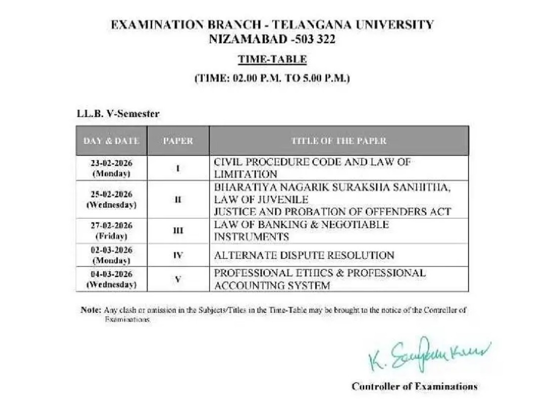 NZB: TU పరిధిలో ఎల్ఎల్బీ ఐదవ సెమిస్టర్ రెగ్యులర్ పరీక్షలు రేపటి నుంచి మార్చ్ 4 వరకు నిర్వహించనున్నట్లు పరీక్షల నియంత్రణ అధికారి ఆచార్య సంపత్ కుమార్ తెలిపారు. ఈ నెల 23, 25, 27 మార్చి 2, 4 తేదీల్లో మధ్యాహ్నం 2 గంటల నుంచి సాయంత్రం 5 గంటల వరకు పరీక్షలు జరగనున్నాయని పేర్కొన్నారు. విద్యార్థులు మిగతా వివరాలకు యూనివర్సిటీ వెబ్సైట్ను సందర్శించలని సూచించారు.