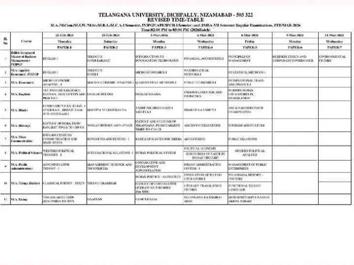 NZB: టి యు పరిధిలో (MA/MSW/MCom/MSc/MBA/MCA), ఇంటిగ్రెటెడ్ పీజీ (APE/PCH/IMBA) మొదటి, IMBA 7వ సెమిస్టర్ రెగ్యులర్ పరీక్షలు ఈ నెల 26 నుంచి ప్రారంభం కానున్నట్లు COE ఆచార్య సంపత్ కుమార్ తెలిపారు. ఈ నెల 26 నుంచి మార్చ్ 11 వరకు మధ్యాహ్నం 2 గం.ల నుంచి 5గం.ల వరకు జరగనున్నాయన్నారు. ఫిబ్రవరి 26, 28, మార్చ్ 2, 4, 6, 9, 11 తేదీల్లో నిర్వహించనున్నారు.
