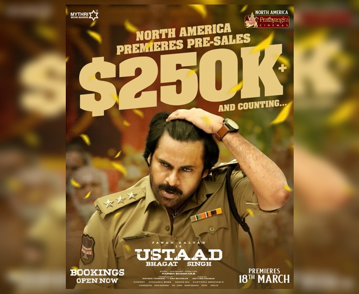 పవన్ కళ్యాణ్, హరీష్ శంకర్ కాంబోలో వస్తున్న ‘ఉస్తాద్ భగత్ సింగ్’ మార్చి 19న విడుదల కానుంది. US మార్కెట్లో ఈ సినిమా రికార్డు సృష్టిస్తోంది. నార్త్ అమెరికాలో ప్రీ సేల్స్ ఇప్పటికే 250K డాలర్ల గ్రాస్ మార్కును దాటినట్లు డిస్ట్రిబ్యూటర్లు తెలిపారు. ప్రీమియర్లకు ఇంకా ఒకరోజు సమయం ఉండగానే ఈ స్థాయి వసూళ్లు రావడం ఈ మూవీ గ్రాండ్ ఓపెనింగ్స్కు సంకేతమని సినీ వర్గాలు తెలిపాయి.