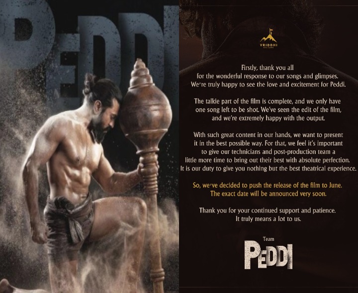 మెగా పవర్ స్టార్ రామ్ చరణ్ హీరోగా, బుచ్చిబాబు దర్శకత్వంలో తెరకెక్కుతున్న ‘పెద్ది’ సినిమా విడుదల వాయిదా పడింది. ఏప్రిల్ 30న విడుదల కావాల్సిన ఈ చిత్రాన్ని, పోస్ట్ ప్రొడక్షన్ పనుల కారణంగా జూన్కు వాయిదా వేస్తున్నట్లు చిత్ర బృందం అధికారికంగా ప్రకటించింది. ఈ మేరకు సోషల్ మీడియా వేదికగా మేకర్స్ ఒక ప్రత్యేక పోస్ట్ను షేర్ చేశారు.