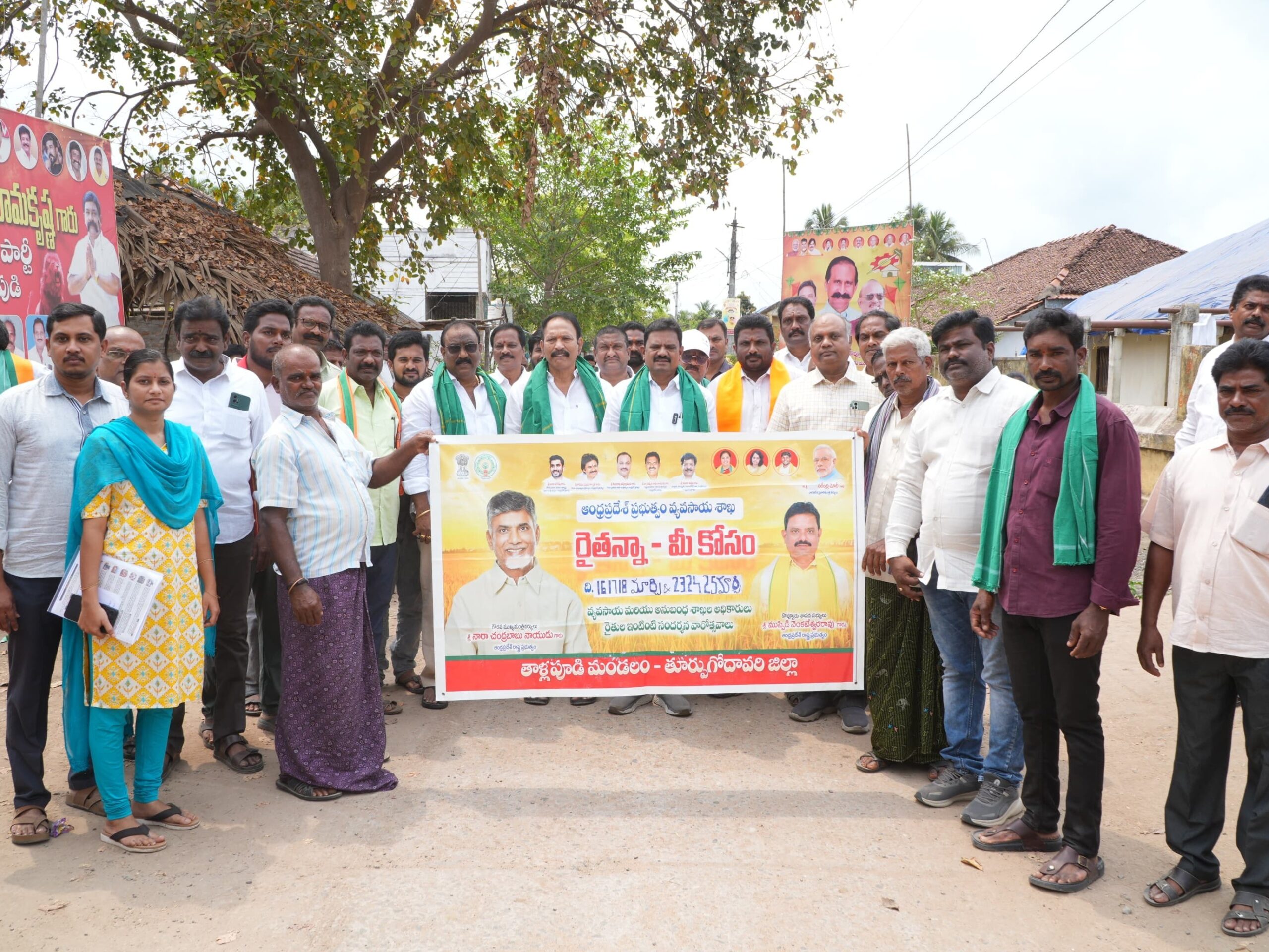 E.G: తాళ్లపూడి మండలం తాడిపూడి గ్రామంలో రైతన్నా-మీకోసం కార్యక్రమం మంగళవారం నిర్వహించారు. ఈ కార్యక్రమంలో కొవ్వూరు ఎమ్మెల్యే ముప్పిడి వెంకటేశ్వరరావు పాల్గొని మాట్లాడారు. కూటమి ప్రభుత్వం రైతు సంక్షేమానికి అధిక ప్రాధాన్యత ఉందని, తద్వారా అన్నదాత సుఖీభవ పథకాన్ని అమలు చేస్తుందని వెల్లడించారు. ఈ కార్యక్రమంలో కూటమి నేతలు పాల్గొన్నారు.