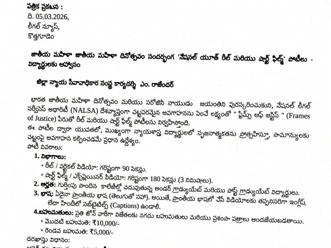 BDK: జిల్లా న్యాయ సేవ అధికార సంస్థ భద్రాద్రి కొత్తగూడెం పరిధిలో ఉన్న లీగల్ ఎయిడ్ డిఫెన్స్ కౌన్సిల్ సిస్టమ్, కొత్తగూడెం లో ఖాళీగా ఉన్న ఆఫీస్ అసిస్టెంట్ / క్లర్క్ -01 పోస్టుకు దరఖాస్తును ఆహ్వానిస్తున్నట్లు జిల్లా న్యాయ సేవ అధికార సంస్థ కార్యదర్శి ఎం.రాజేందర్ గురువారం ప్రకటనలో తెలిపారు. కావున ఆసక్తి కలిగిన అభ్యర్థులు దరఖాస్తు చేసుకోవాలని తెలిపారు.