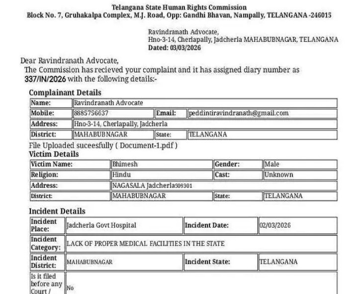 MBNR: రాష్ట్ర వ్యాప్తంగా సంచలమైన సృష్టించిన ప్రభుత్వాసుపత్రిలో మృతదేహాన్ని కుక్క పీక్కుతిన్న సంఘటనపై జడ్చర్లకు చెందిన న్యాయవాది పెద్దింటి రవీంద్రనాథ్ రాష్ట్ర మానవ హక్కుల కమిషన్లో ఫిర్యాదు చేశారు. ఆయన మాట్లాడుతూ.. ప్రభుత్వాసుపత్రిలో అధికారులు సిబ్బంది నిర్లక్ష్యం కారణంగా ఈ సంఘటన జరిగిందని ఆగ్రహం వ్యక్తం చేశారు. ఈ ఘటనపై చర్యలు తీసుకోవాలని కోరారు.