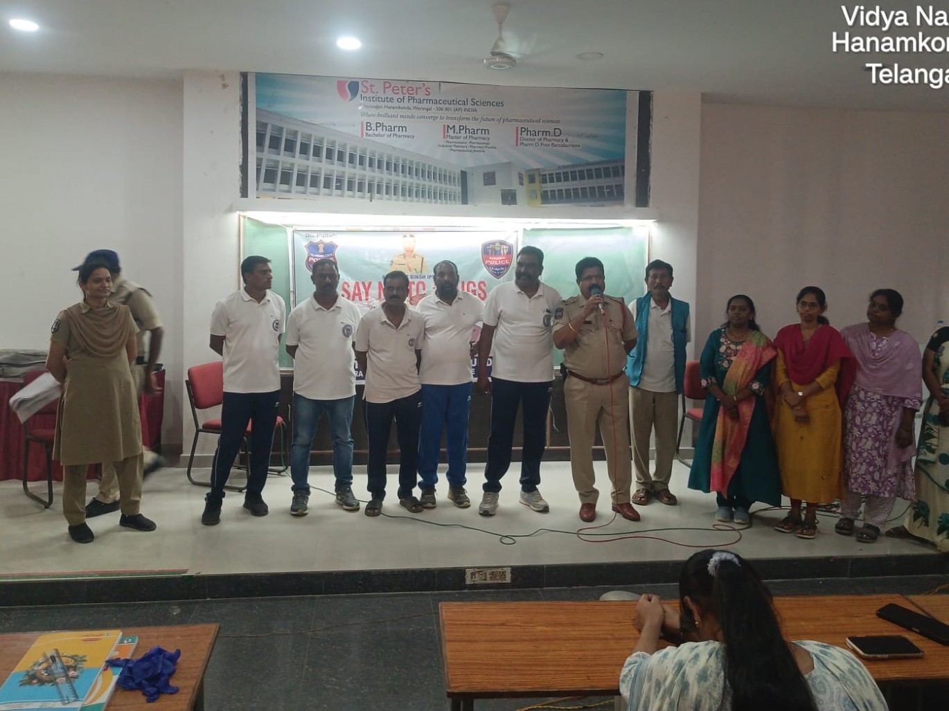 హన్మకొండ నగరంలోని ఎస్ టీ పీటర్స్ ఫార్మసీ కళాశాలలో సోమవారం జాగృతి పోలీస్ కళాబృందం ఆధ్వర్యంలో మత్తు పదార్థాలపై అవగాహన కార్యక్రమం నిర్వహించారు. సుబేదారి ఎస్సై ఫణి హాజరై యువత మత్తు పదార్థాలకు దూరంగా ఉండాలని సూచించారు. గంజాయి విక్రయం లేదా వినియోగంపై సమాచారం ఉంటే 8712584473కు తెలియజేయాలని, సైబర్ నేరాల ఫిర్యాదుల కోసం 1930 హెల్ప్లైన్ను వినియోగించాలని సూచించారు.