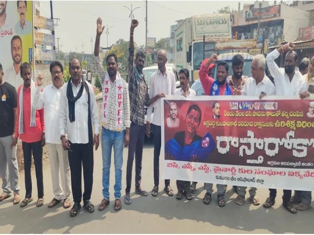ASF: కుమ్మేర గ్రామంలో మల్లికార్జున స్వామి ఆలయంలో ఇటీవల చోటుచేసుకున్న ఘటనను నిరసిస్తూ శనివారం జిల్లా కేంద్రంలోని డాక్టర్ బాబాసాహెబ్ అంబేద్కర్ చౌక్ వద్ద వివిధ కుల సంఘాల ఆధ్వర్యంలో రాస్తారోకో కార్యక్రమం నిర్వహించారు. ఈ సందర్భంగా పసిపాప మృతి ఘటనకు కారణమైన అగ్రవర్ణ నాయకులపై ఇప్పటివరకు ఎటువంటి చర్యలు తీసుకోకపోవడంపై ఆగ్రహం వ్యక్తం చేశారు.