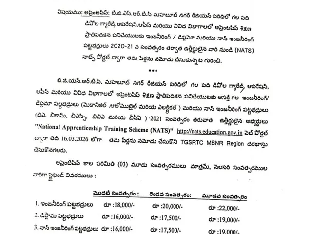 MBNR: మహబూబ్ నగర్ రీజియన్ పరిధిలో 10 RTC డిపోల గ్యారేజ్, వివిధ విభాగాల్లో అప్రెంటిషిప్ శిక్షణ ప్రతిపాదికన పనిచేయుటకు ఇంజనీరింగ్, డిప్లమా, పట్టభద్రులు, నాన్ ఇంజనీరింగ్ పట్టభద్రులు BA, BSC, BCOMలో 2021 తర్వాత ఉత్తీర్ణులైన అభ్యర్థులు nttp:nats.education.gov.in వెబ్సైట్లో మార్చి 16 లోగా దరఖాస్తు చేసుకోవాలని రీజనల్ మేనేజర్ సంతోష్ కుమార్ తెలిపారు.