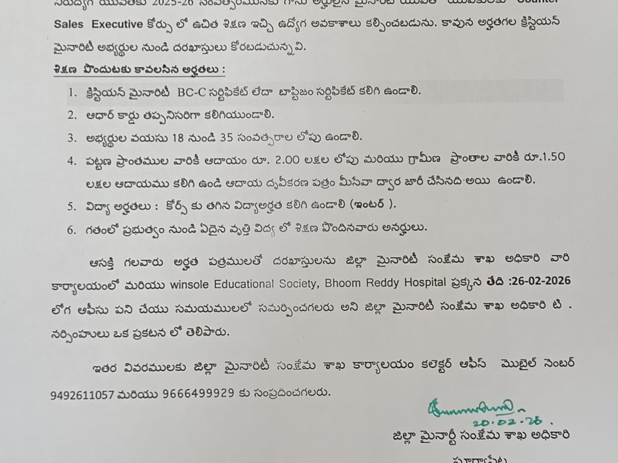 SRPT: జిల్లాలోని నిరుద్యోగ క్రైస్తవ మైనారిటీ యువతకు ‘కౌంటర్ సేల్స్ ఎగ్జిక్యూటివ్’ కోర్సులో ఉచిత శిక్షణతో పాటు ఉద్యోగ అవకాశాలు కల్పించనున్నట్లు జిల్లా మైనారిటీ సంక్షేమ అధికారి నర్సింహులు తెలిపారు. 18-35 ఏళ్ల లోపు వయస్సు, ఇంటర్ అర్హత కలిగిన వారు ఈ నెల 26లోగా కలెక్టరేట్లో దరఖాస్తు చేసుకోవాలని కోరారు. వివరాలకు 9492611057ను సంప్రదించాలని అన్నారు.