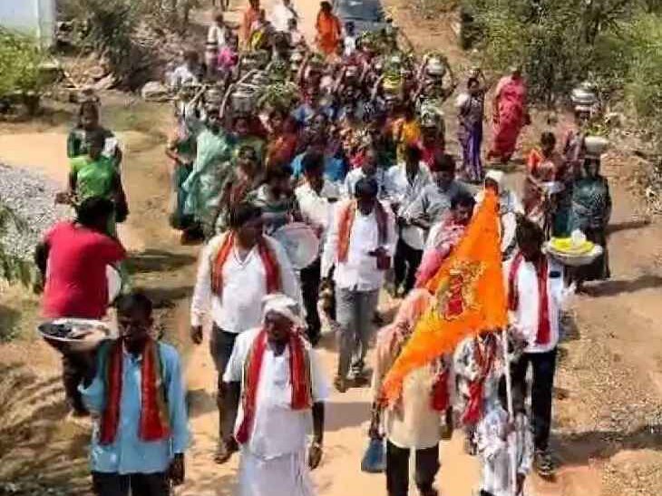 SDPT: హుస్నాబాద్ మండలం మీర్జాపూర్ గ్రామంలో నూతనంగా నిర్మించిన ముదిరాజ్ కులదేవత శ్రీ పెద్దమ్మతల్లి దేవాలయ సింహద్వార రోహణం, దర్వాజా ముహూర్తం శనివారం ఘనంగా నిర్వహించారు. గ్రామస్థులు ఇంటింటి నుంచి బిందెలతో నీళ్లు, కొబ్బరికాయలు, కుంకుమ, పసుపు తీసుకుని డప్పు చప్పుళ్ల మధ్య ఊరేగింపుగా ఆలయానికి చేరుకుని కార్యక్రమాన్ని నిర్వహించారు. భక్తుల పూనకాలతో ఆలయ ప్రాంగణం సందడి నెలకొంది.