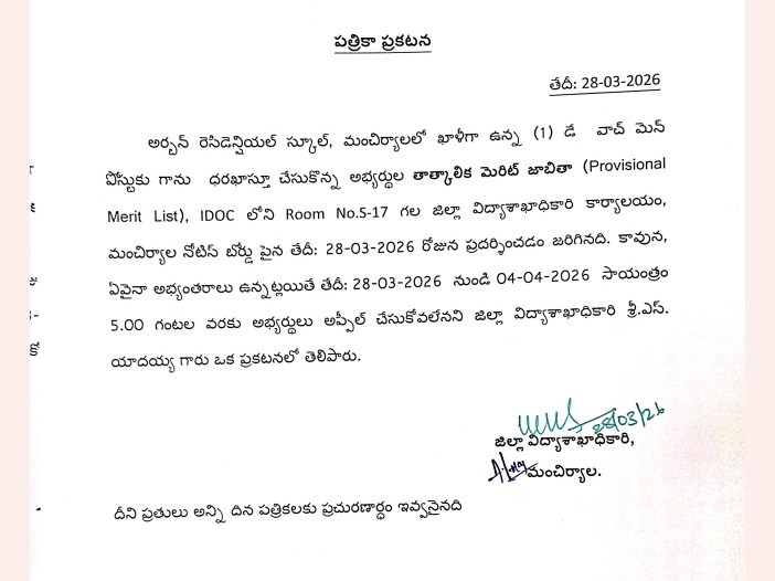 మంచిర్యాలలోని అర్బన్ రెసిడెన్షియల్ స్కూల్లో డే వాచ్ మెన్ పోస్టుకు దరఖాస్తు చేసుకున్న అభ్యర్థుల తాత్కాలిక మెరిట్ జాబితా విడుదల చేసినట్లు డీఈవో యాదయ్య తెలిపారు. నస్పూర్లోని కలెక్టరేట్లో జిల్లా విద్యాశాఖ కార్యాలయం నోటీస్ బోర్డుపై ప్రదర్శించినట్లు పేర్కొన్నారు. ఏమైనా అభ్యంతరాలు ఉంటే ఏప్రిల్ 4 సాయంత్రం 5 గంటల వరకు అప్పీల్ చేసుకోవాలని సూచించారు.