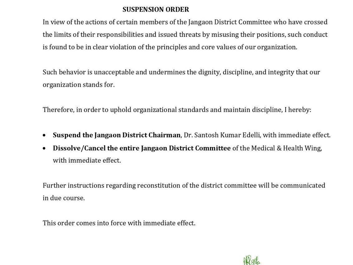 JN: జిల్లా కాంగ్రెస్ మెడికల్ & హెల్త్ వింగ్ చైర్మెన్ డా.ఎడెల్లి సంతోష్ కుమార్ పై సస్పెన్షన్ వేటు పడింది. నియమ నిబంధనలు ఉల్లంఘించి బెదిరింపులకు పాల్పడిన కారణంగా జిల్లా ఛైర్మన్ పై ఈ వేటు పడినట్లు తెలిపారు. అలాగే మొత్తం జిల్లా కమిటీని రద్దు చేస్తున్నట్లు ప్రకటించారు. కొత్త కమిటీపై త్వరలో నిర్ణయం తీసుకోనున్నారు తెలిపారు.