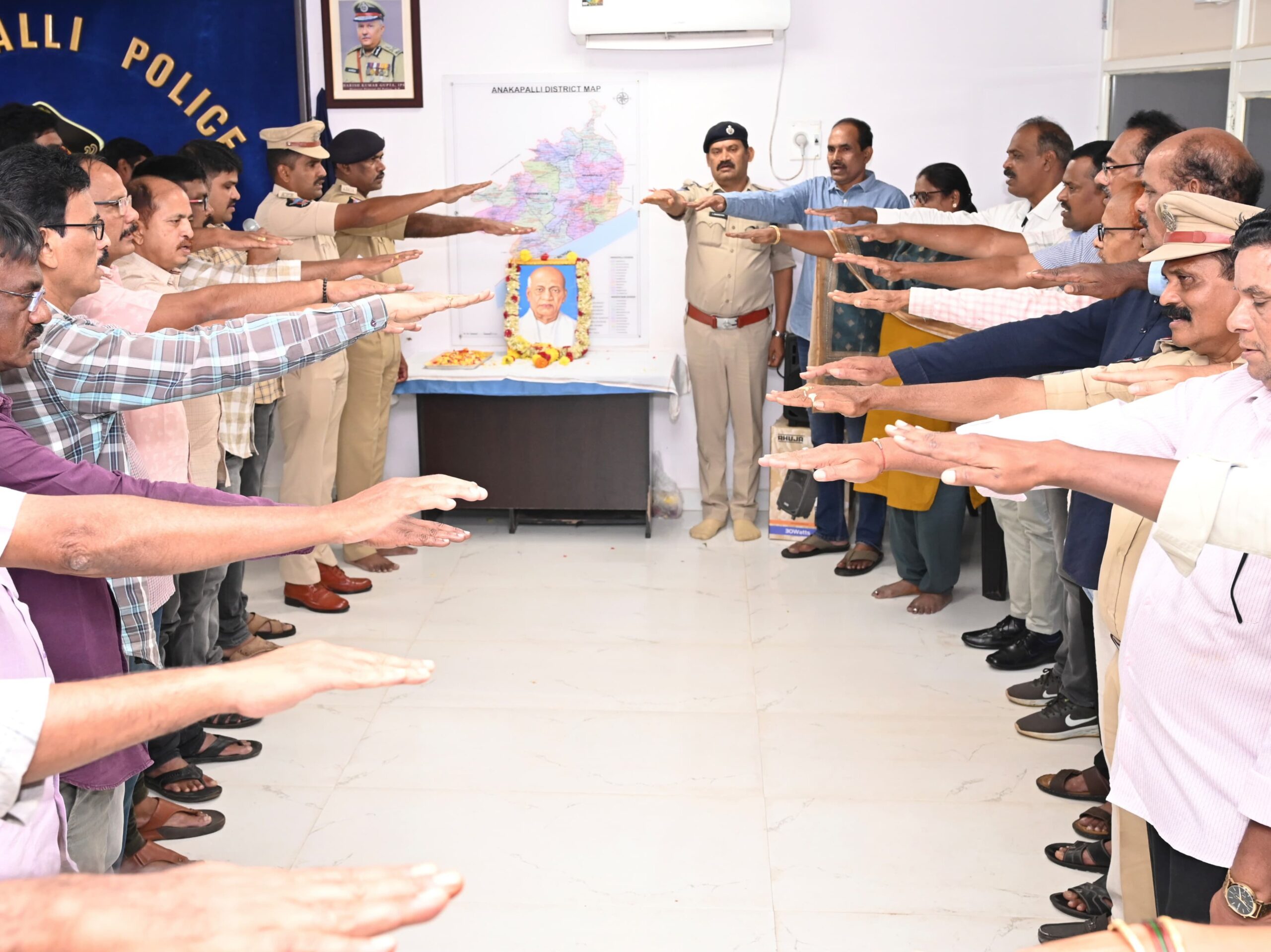 AKP: సర్దార్ వల్లభాయ్ పటేల్ జయంతి సందర్భంగా అనకాపల్లి జిల్లా పోలీస్ కార్యాలయంలో శుక్రవారం జాతీయ సమైక్యత దినోత్సవం నిర్వహించారు. ఈ కార్యక్రమంలో జిల్లా అదనపు ఎస్పీలు దేవప్రసాద్, మోహన్ రావు పటేల్ విగ్రహానికి పూలమాలవేసి నివాళులు అర్పించారు. దేశ సమగ్రత, ఐక్యత, భద్రతను కాపాడడానికి కృషి చేస్తామని పోలీసులతో ప్రతిజ్ఞ చేయించారు.
