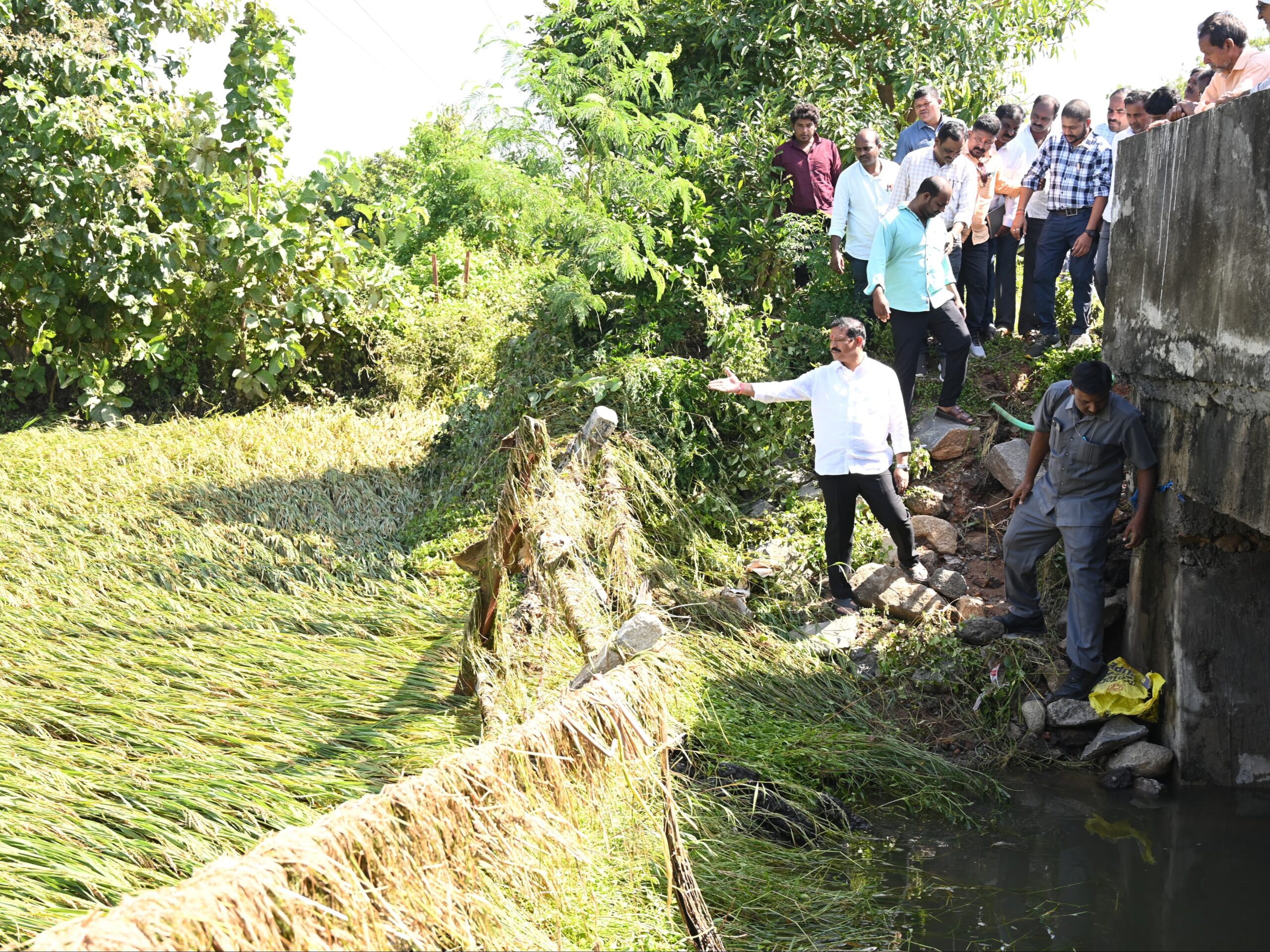 MHBD: మున్సిపాలిటీ పరిధిలోని ఏటిగడ్డతండా సమీపంలో మున్నేరు వాగు వద్ద మొంథా తుఫాన్ ప్రభావంతో దెబ్బతిన్న రోడ్డు, కూలిన విద్యుత్ స్తంభాలు, ఇసుక మేటలతో నష్టపోయిన వరి పొలాలను ఎమ్మెల్యే డా. భూక్యా మురళీ నాయక్ గురువారం పరిశీలించారు. నష్టపోయిన రైతులను ప్రభుత్వం ఆదుకుంటుందని హామీ ఇచ్చారు. ప్రజల భద్రత దృష్ట్యా తగిన చర్యలు తీసుకోవాలని అధికారులను ఆదేశించారు.