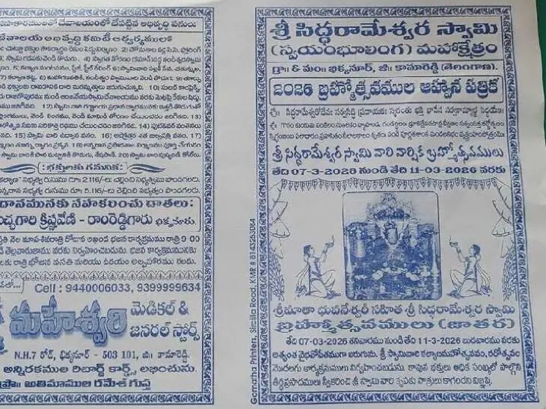 KMR: భిక్కనూర్లోని సిద్ధరామేశ్వర స్వామి ఆలయంలో 2026 వార్షిక బ్రహ్మోత్సవాలు మార్చి 7 నుంచి 11 వరకు జరగనున్నాయి. భువనేశ్వరీ సహిత స్వామి వారికి పుణ్యహవాచనం, అంకురార్పణం, రుద్రాభిషేకం, కల్యాణోత్సవం, విమాన రథోత్సవం, అవభృథ స్నానం నిర్వహించనున్నారు. అగ్నిగుండాలు, వీరభద్ర ప్రస్తావన, సాంస్కృతిక కార్యక్రమాలు ప్రత్యేక ఆకర్షణగా నిలవనున్నాయి.