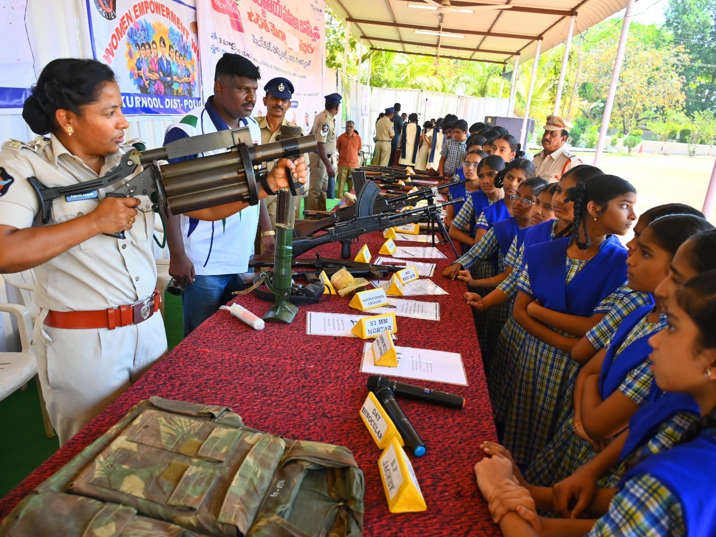 కర్నూలు: అంతర్జాతీయ మహిళా దినోత్సవ వారోత్సవాలలో భాగంగా జిల్లా ఎస్పీ విక్రాంత్ పాటిల్ ఆదేశాల మేరకు శుక్రవారం జిల్లా పోలీసు కార్యాలయంలోని పరేడ్ మైదానంలో విద్యార్థులకు ఓపెన్ హౌస్ కార్యక్రమం నిర్వహించారు. పోలీసు ఆయుధాల ప్రదర్శన ఏర్పాటు చేసి, వాటి వినియోగం, ప్రాధాన్యత గురించి విద్యార్థులకు వివరించారు.
