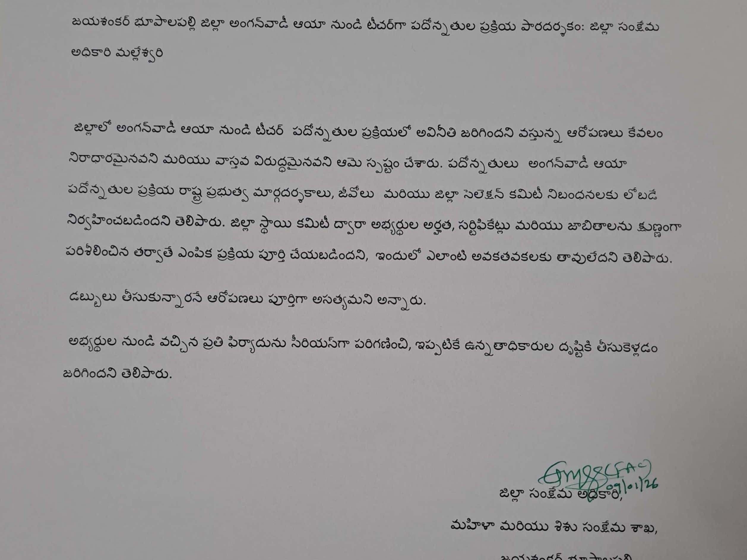 BHPL: జిల్లాలో అంగన్వాడీ ఆయా నుంచి టీచర్ పదోన్నతుల్లో అవినీతి జరిగిందనే ఆరోపణలు నిరాధారమని, అవి వాస్తవ విరుద్ధమని జిల్లా సంక్షేమ అధికారి మల్లేశ్వరి స్పష్టం చేశారు. పదోన్నతులు రాష్ట్ర ప్రభుత్వ మార్గదర్శకాలు, జీవోలు, జిల్లా సెలెక్షన్ కమిటీ నిబంధనలకు అనుగుణంగా జరిగాయన్నారు. అర్హతలు, సర్టిఫికేట్లు క్షుణ్ణంగా పరిశీలించిన తర్వాతే ఎంపిక జరిగిందని ఆయన అన్నారు.