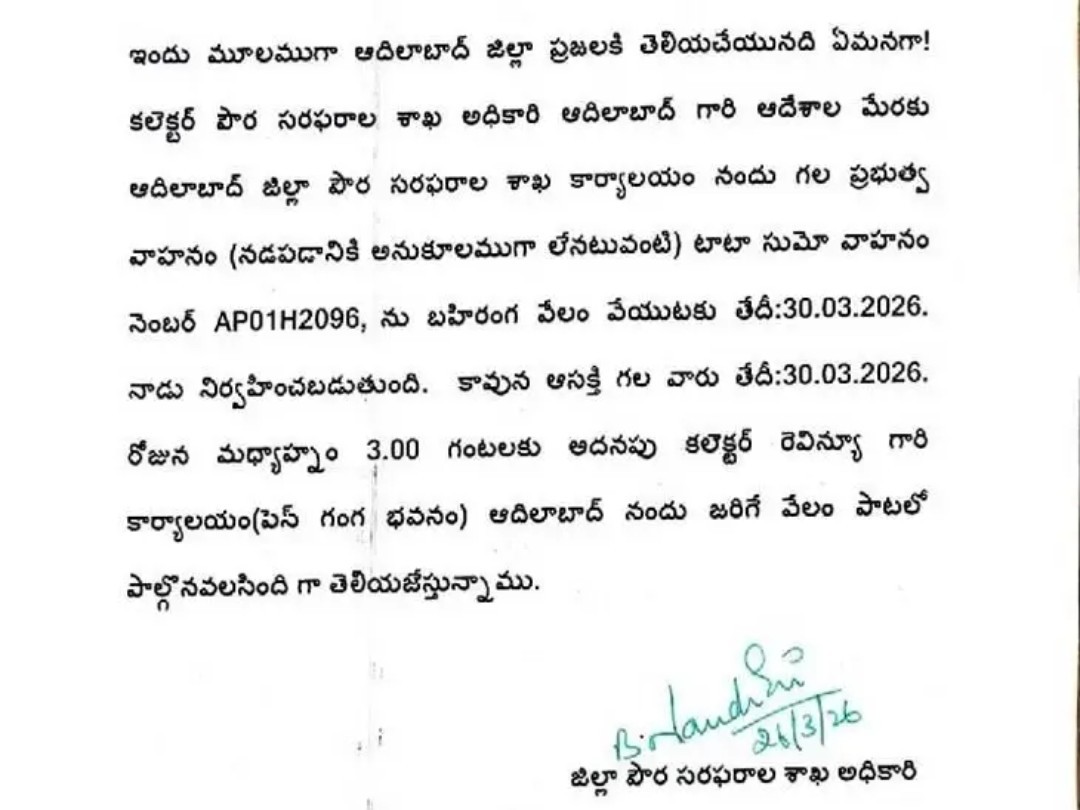 ఆదిలాబాద్ జిల్లా పౌర సరఫరాల శాఖలో గల ప్రభుత్వ వాహనం (నడపడానికి అనుకూలంగా లేని) టాటా సుమో వాహనాన్ని ఈనెల 30న బహిరంగ వేలం వేస్తున్నట్లు DSO నందిని తెలిపారు. ఆసక్తి గల వారు 30న మధ్యాహ్నం 3 గంటలకు అదనపు కలెక్టర్ రెవిన్యూ కార్యాలయంలో జరిగే వేలం పాటలో పాల్గొనాలని సూచించారు.