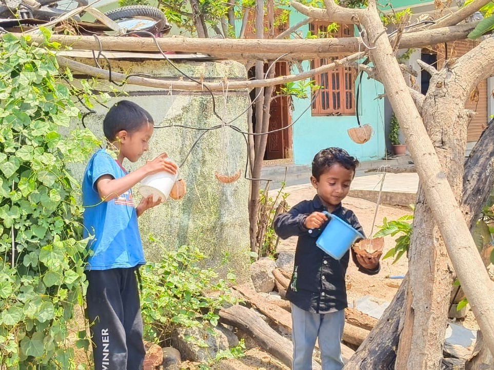 SDPT: వేసవిలో ఎండ వేడిమికి దాహార్తితో అల్లాడుతున్న పక్షులకు చిన్నారులు తమవంతు సాయం అందిస్తున్నారు. హుస్నాబాద్ మండలం గాంధీనగర్ కు చెందిన చిన్నారులు అకిరా నందన్, అద్వైత్, కొబ్బరి చిప్పలతో పక్షులకు నీరు అందిస్తున్నారు. ఇంటి ముందు పెరటి తోటలో చల్లని నీటిని అందిస్తూ పక్షుల ప్రాణాలు కాపాడుతున్నారు. చిన్నారుల సేవ గుణం చూసి పలువురు పిల్లలను ప్రశంసిస్తున్నారు