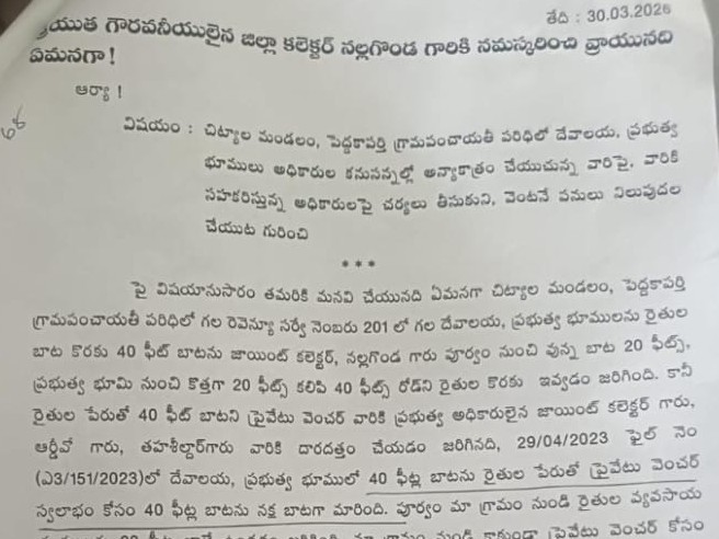 NLG: చిట్యాల మండలం పెద్దకాపర్తి గ్రామం లోని దేవాలయ ప్రభుత్వ భూములు అన్యాక్రాంతంపై విచారణ జరిపి చర్యలు తీసుకోవాలని గ్రామస్తులు ఇవాళ జిల్లా కలెక్టర్కు ఫిర్యాదు చేశారు. ఈ భూముల్లో ప్రైవేటు వారు చేపట్టిన పనులను నిలిపివేసి ప్రభుత్వ భూములను కాపాడాలని గ్రామస్తులు కోరుతున్నారు.
