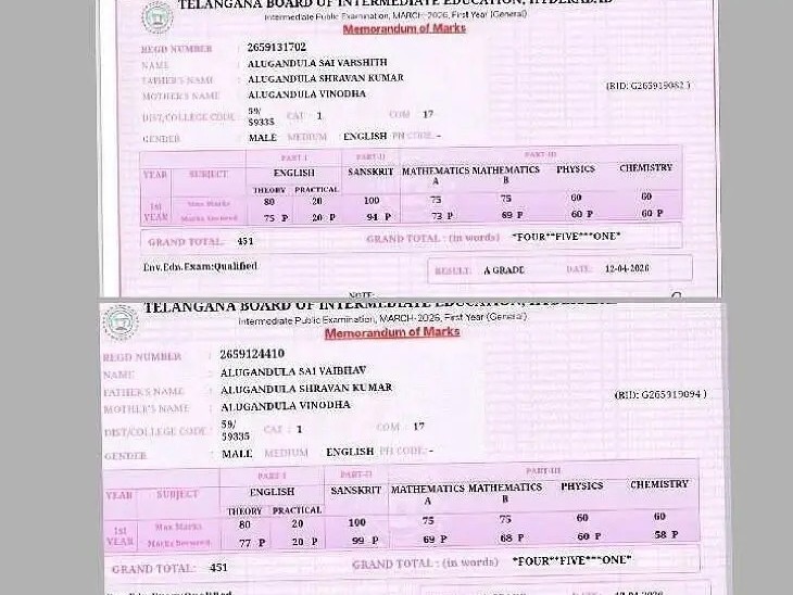 JGL: జగిత్యాల సాయిరాంనగర్కు చెందిన ఎలగందుల శ్రావణ్-వినోద దంపతులకు సాయివర్షిత్, సాయివైభవ్ అనే కవలలు జన్మించారు. చిన్నప్పటి నుంచి వారు ఇద్దరూ ఒకే క్లాసు చదువుతున్నారు. అయితే విచిత్రమేమిటంటే ఇంటర్లో వారిద్దరికి సమాన మార్కులు రావడం. ఇటీవల విడుదలైన ఇంటర్ ఫలితాల్లో MPCలో ఇద్దరికీ సమానంగా 451 మార్కులు వచ్చాయి.