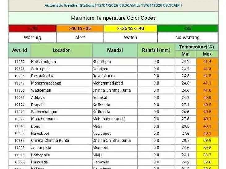 MBNR: జిల్లాలో వేసవి ఉష్ణోగ్రతలు రోజురోజుకు పెరుగుతున్నాయి. గత 24 గంటల్లో భూత్పూర్ మండలం కొత్త మొల్గరలో 41.4 డిగ్రీల గరిష్ఠ ఉష్ణోగ్రత నమోదైంది. సల్కర్పేట 41.3, దేవరకద్ర 41.2, మహమ్మదాబాద్ 41.1 డిగ్రీలు నమోదయ్యాయి. వడ్డేమాన్ 41.0, అడ్డాకుల 40.8, పారుపల్లి, సిరి వెంకటపూర్ 40.5, నవాబుపేట, మహబూబ్నగర్ అర్బన్లో 40.1 డిగ్రీలు నమోదయ్యాయి.