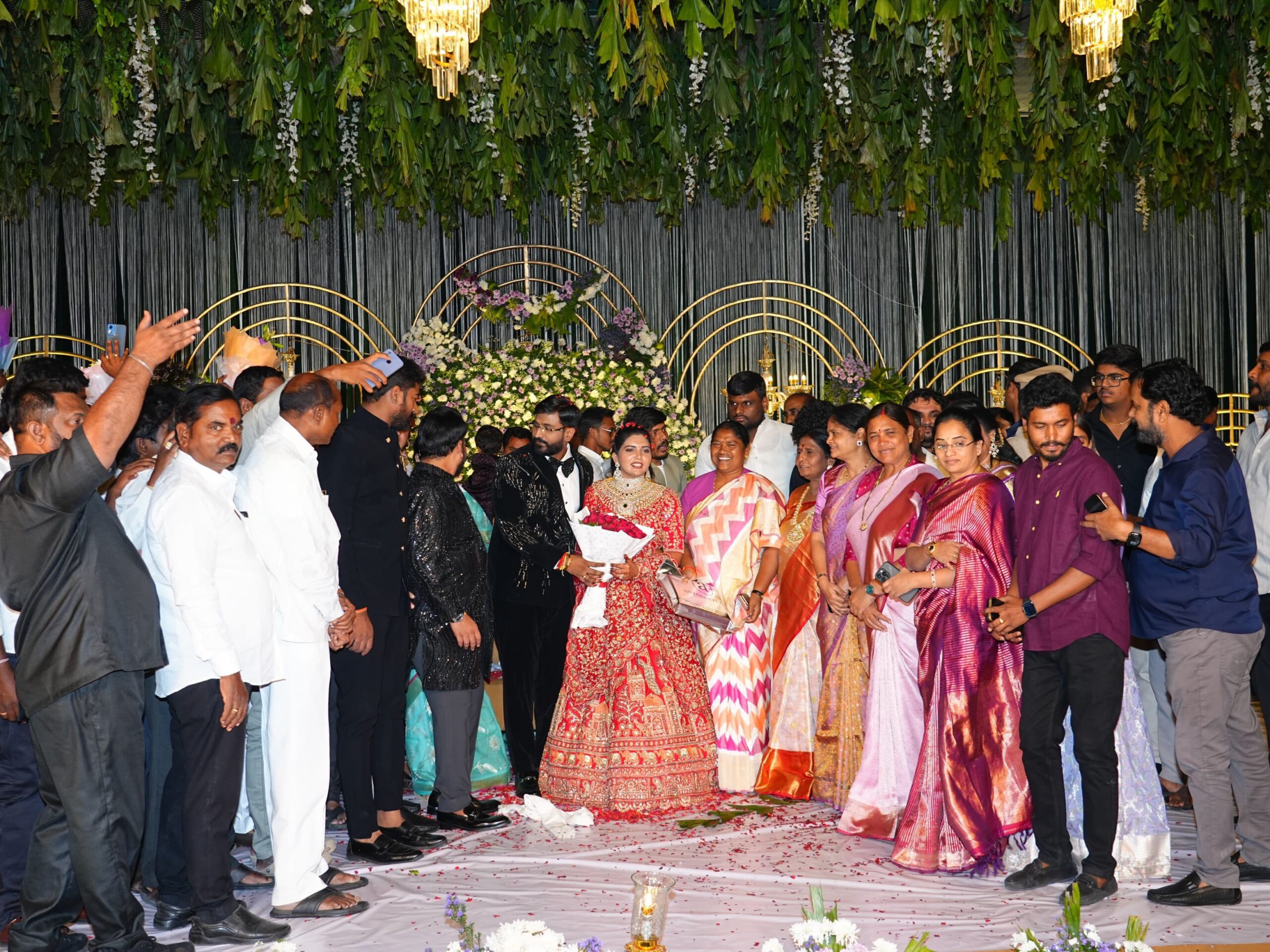 MLG: HYDలో ఆదివారం రాత్రి MLC బల్మూరి వెంకట్ రిసెప్షన్ వేడుకలు ఘనంగా జరిగాయి. ఈ రిసెప్షన్ వేడుకలకు రాష్ట్ర మంత్రి సీతక్క హాజరై, నూతన వధూవరులను ఆశీర్వదించారు. అనంతరం నూతన వధూవరులకు బహుమతి అందజేశారు. ఈ కార్యక్రమంలో కాంగ్రెస్ ముఖ్య నాయకులు, NSUI నాయకులు తదితరులు ఉన్నారు.