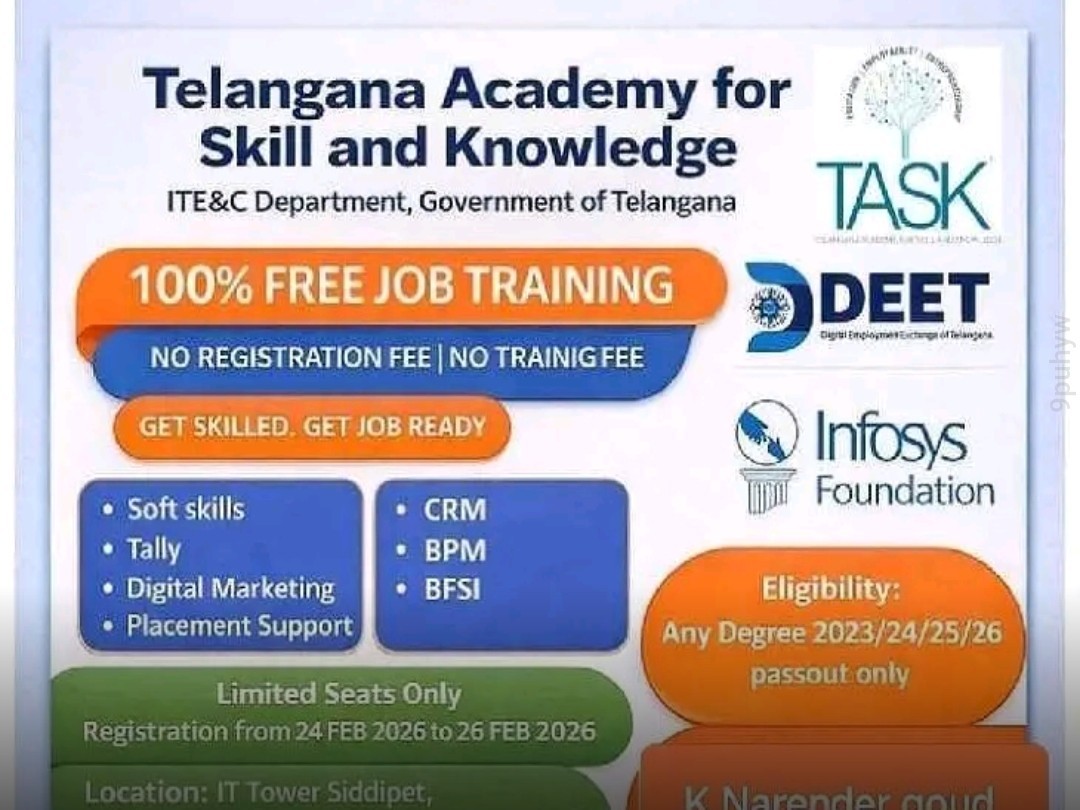 SDPT: సిద్దిపేట ఐటీ టవర్లోని టాస్క్ కేంద్రంలో నిరుద్యోగ యువతకు ‘ట్రైనింగ్ కమ్ ప్లేస్మెంట్’ అవకాశం కల్పిస్తున్నట్లు మేనేజర్ నరేందర్ గౌడ్ తెలిపారు. ఇన్ఫోసిస్, డీట్, టాస్క్ సంయుక్త ఆధ్వర్యంలో ఈ శిక్షణ ఉంటుంది. 2023-2026 మధ్య బీటెక్, డిగ్రీ పూర్తి చేసిన వారు అర్హులు. గురువారం సాయంత్రం లోగా ఉచితంగా రిజిస్ట్రేషన్ చేసుకోవాలని, కేవలం మొదటి 200 మందికి అవకాశమున్నట్లు పేర్కొన్నారు.