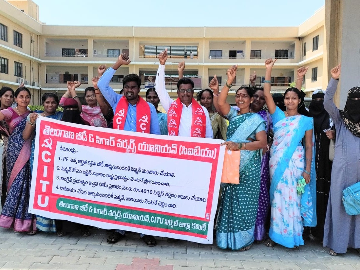 NRML: బీడీ కార్మికుల సమస్యలను పరిష్కరించాలని కోరుతూ సీఐటీయూ ఆధ్వర్యంలో గురువారం జిల్లా కలెక్టర్ కార్యాలయం ముందు ధర్నా నిర్వహించారు. అనంతరం ఏవోకు వినతిపత్రం సమర్పించారు. ఈ సందర్భంగా సీఐటీయూ జిల్లా ప్రధాన కార్యదర్శి బొమ్మెన సురేష్ మాట్లాడుతూ, పీఎఫ్ ఉన్న అర్హత గల బీడీ కార్మికులందరికీ పెన్షన్ మంజూరు చేయాలని డిమాండ్ చేశారు.
