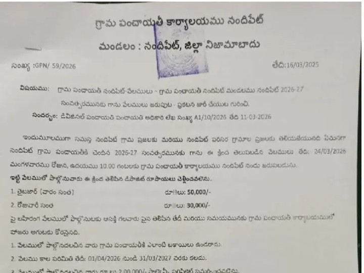 NZB: నందిపేట్ గ్రామపంచాయతీ 2026-27 సంవత్సరానికి త్రైబజార్ (సోమవారం అంగడి, రోజువారీ సంత) వేలంపాటను మార్చి 24, 2026 మంగళవారం నిర్వహించనున్నారు. ఉదయం 10 గంటలకు పంచాయతీ కార్యాలయంలో ఈ వేలాన్ని నిర్వహించనున్నట్లు కార్యదర్శి మహేందర్ బుధవారం తెలిపారు. పాల్గొనదలచిన వారు నిర్ణీత డిపాజిట్తో హాజరుకావాలన్నారు.