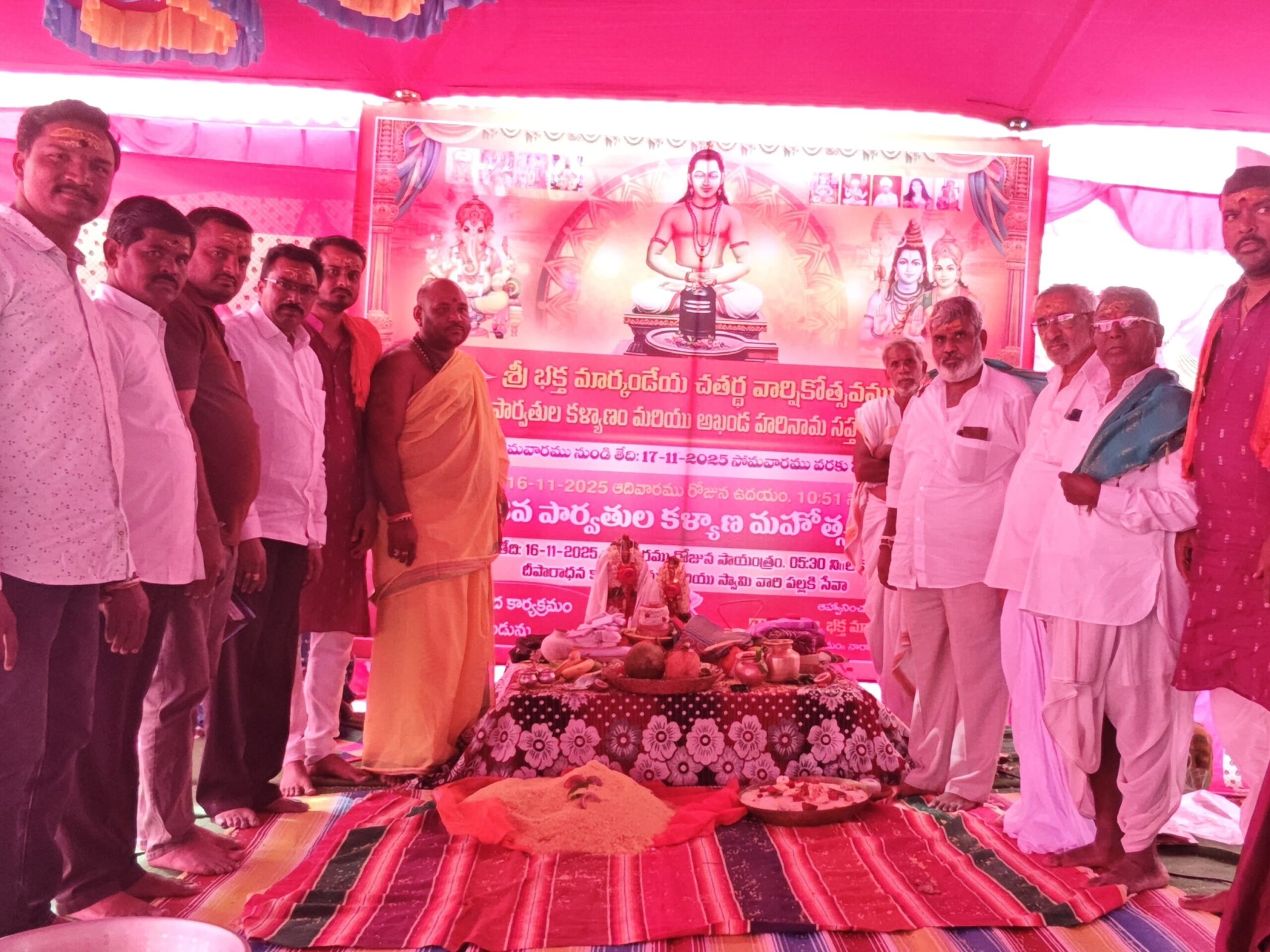 SRD: ఖేడ్ మండలం లింగాపూర్ గ్రామంలో కొలువైన మార్కండేయ స్వామి ఆలయంలో ఆదివారం శివపార్వతుల కళ్యాణ మహోత్సవం వైభవంగా జరిగింది. ఆలయ నాలుగో వార్షికోత్సవం సందర్భంగా పద్మశాలి కుల బాంధవులు, ఆలయ కమిటీ, గ్రామస్థుల ఆధ్వర్యంలో ఈ కళ్యాణాన్ని వేదమంత్రోచ్ఛారణల మధ్య నిర్వహించారు. చుట్టుపక్కల గ్రామాల నుంచి పెద్ద సంఖ్యలో భక్తులు తరలివచ్చి కళ్యాణం తిలకించారు.