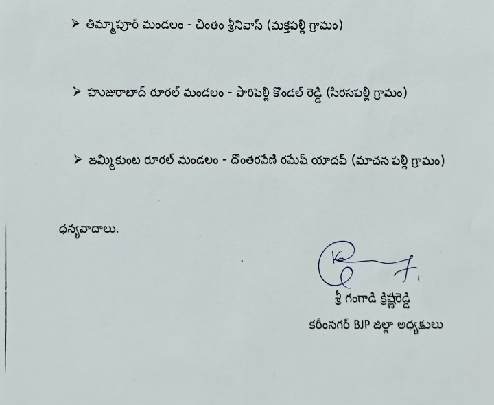 KNR: కరీంనగర్ జిల్లా తిమ్మాపూర్ హుజురాబాద్ రూరల్, జమ్మికుంట రూరల్ మండల శాఖలకు నూతన అధ్యక్షులను నియమించినట్టు బీజేపీ జిల్లా అధ్యక్షుడు గంగాడి కృష్ణారెడ్డి ప్రకటన విడుదల చేశారు. తిమ్మాపూర్ మండల అధ్యక్షులుగా చింతం శ్రీనివాస్, హుజురాబాద్ రూరల్ అధ్యక్షులుగా పారిపల్లి కొండల్ రెడ్డి, జమ్మికుంట రూరల్ అధ్యక్షులుగా దొంతన వేణి రమేష్లను నియమించారు.