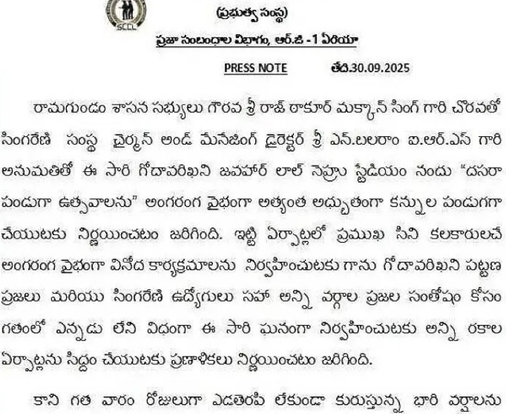 PDPL: గోదావరిఖని జవహార్ లాల్ నెహ్రూ స్టేడియంలో చేపట్టే దసరా పండుగ ఉత్సవాలను తాత్కలికంగా వాయిదా వేసినట్లు సింగరేణి ఆర్జీ 1 యాజమాన్యం ఓ ప్రకటనలో పేర్కొంది. వారం రోజులుగా ఎడతెరపి లేకుండా కురుస్తున్న భారీ వర్షాలను దృష్టిలో ఉంచుకుని వాతావరణ పరిస్థితులను పరిశీలించి తాత్కలికంగా వాయిదా వేసేందుకు నిర్ణయించినట్లు తెలిపింది.