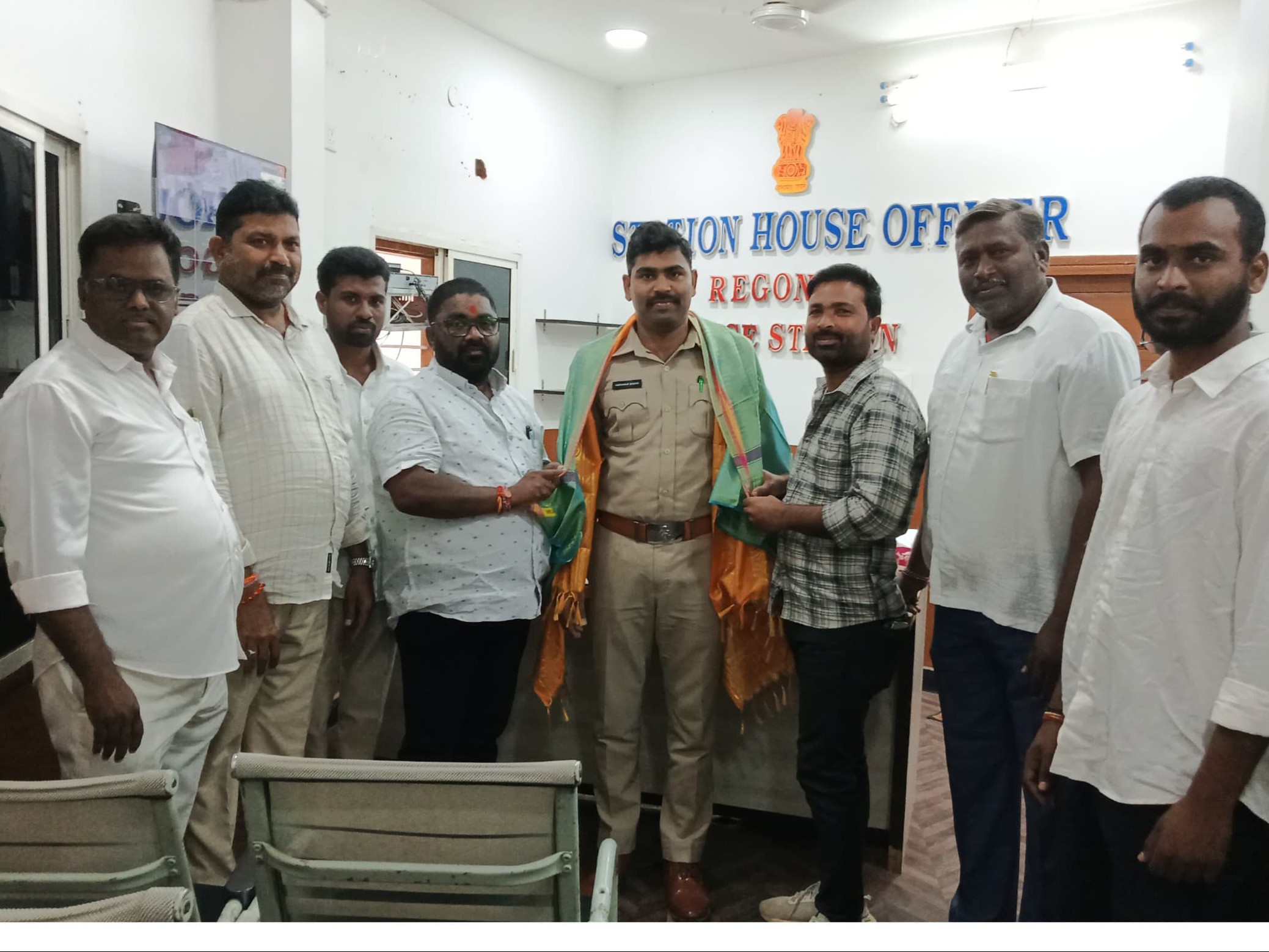 BHPL: రేగొండ మండల నూతన SIగా ఇటీవల బాధ్యతలు చేపట్టిన సుధాకర్ను శనివారం దుంపిల్లపల్లి గ్రామ సర్పంచ్ అజ్మీర రాజేందర్, వార్డు మెంబర్లు రవి, బిక్షపతి మర్యాదపూర్వకంగా కలిశారు. ఈ సందర్భంగా నూతన SIను శాలువతో ఘనంగా సన్మానించారు. ఈ కార్యక్రమంలో కాంగ్రెస్ నాయకులు రాజు అజ్మీర్, ప్రవీణ్, కాంగ్రెస్ సీనియర్ నాయకులు ఎండి షాబిర్ తదితరులు ఉన్నారు.