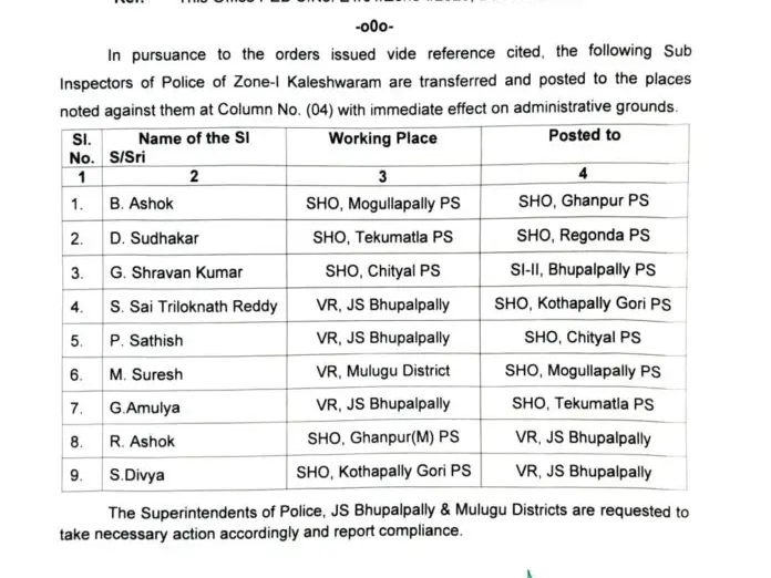 BHPL: జిల్లాలో మంగళవారం ఒకే సారి 9 మంది ఎస్సైలు బదిలీ అయ్యారు. ఈ మేరకు రామగుండం కమిషనర్ ఆఫ్ పోలీస్ ఉత్తర్వులు జారీ చేశారు. మొగుళ్లపల్లి, గణపురం, రేగొండ, చిట్యాల, కొత్తపల్లి, భూపాలపల్లి వీఆర్, ములుగు వీఆర్లోని స్టేషన్లలో బదిలీ కాగా, ఆ స్థానాల్లో నూతన ఎస్సైలు నియమించబడ్డారు. ఈ మార్పులు స్థానిక పోలీస్ సిబ్బంది సమర్థవంతంగా నియమించడానికి చేపట్టినట్లు అధికారులు తెలపారు.